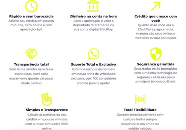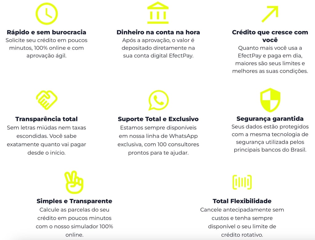 A EfectPay oferece crédito 100% digital, com análise ágil, taxas justas e experiência totalmente transparente. Feito para empreendedores que precisam crescer sem perder tempo.